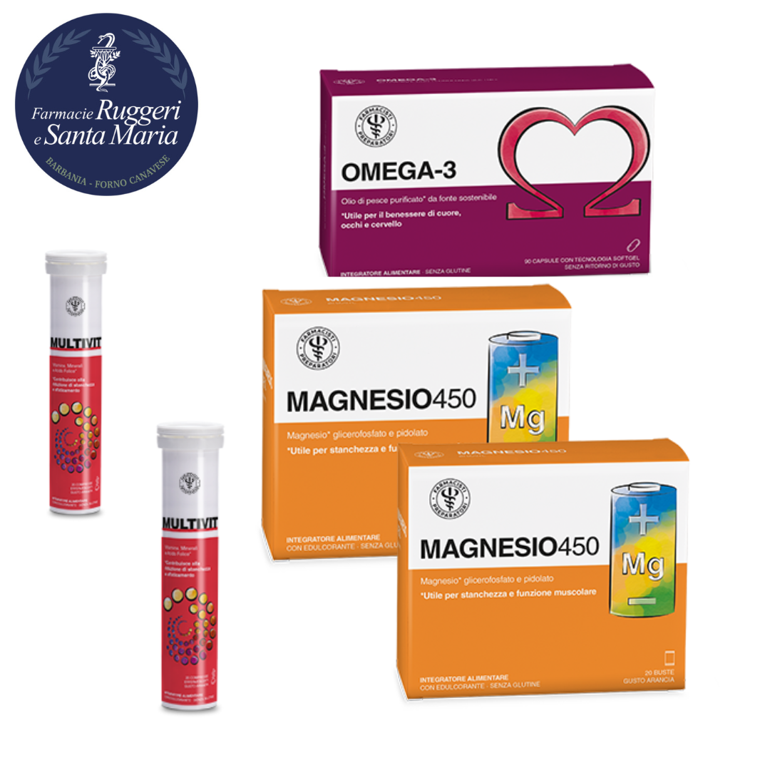 La Box contiene: 2 MULTIVIT, 2 MAGNESIO 450, 1 OMEGA-3