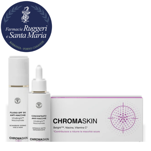 Fluido anti-macchie airless 50ml + Concentrato anti-macchie flacone con contagocce 30 ml + Chromaskin 30 compresse rivestite